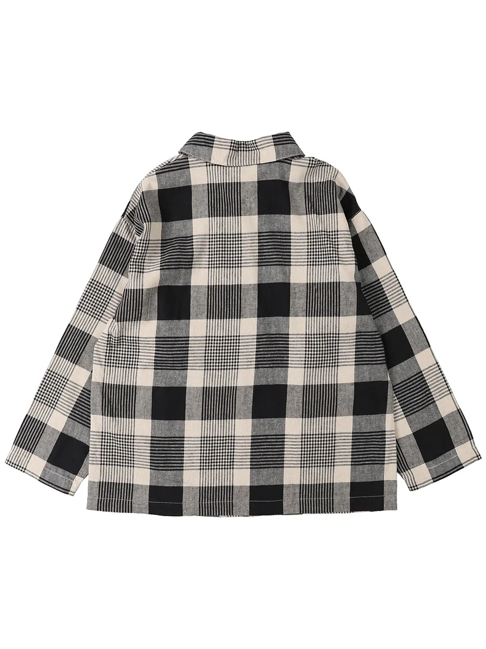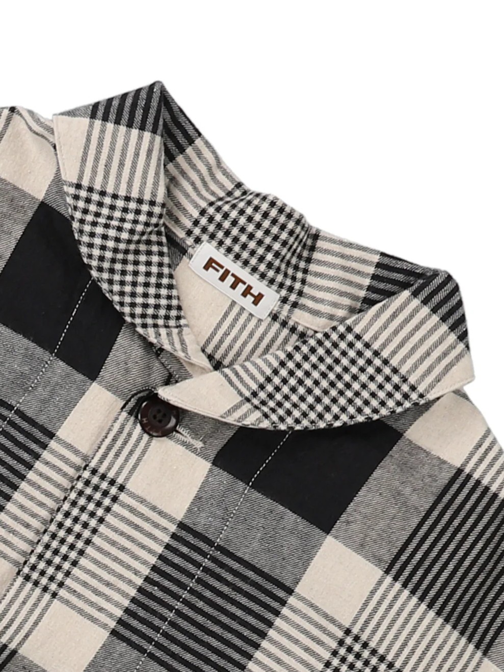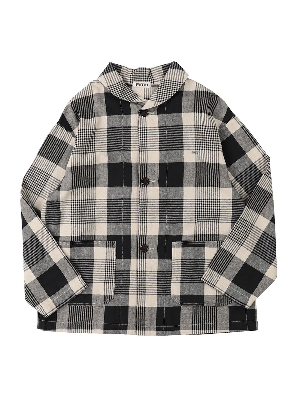 The Relaxing Cotton Linen Twill Jacket by FITH features a fabric treated with a specialized craft washer process to create a vintage-like textured surface with wrinkles and a relaxed, sun-dried feel. Each roll of material is processed individually, resulting in a handcrafted, richly textured look that ensures unique character for every jacket. This jacket is available in basic deck stripe and big check patterns, combining artisanal textile treatment with a distinct, natural aesthetic.