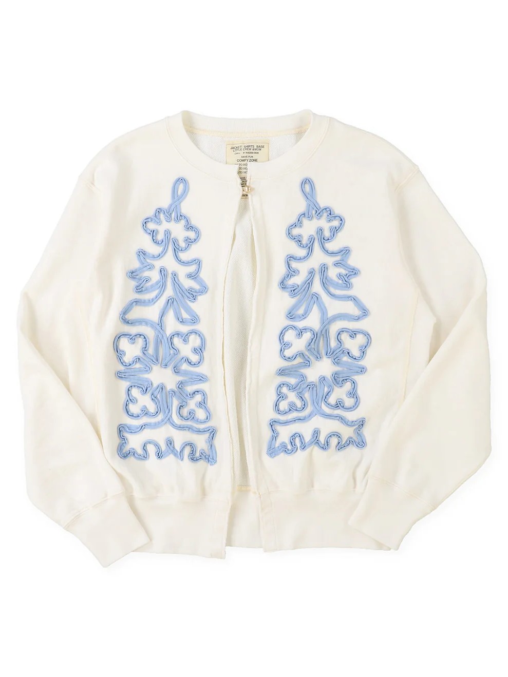 The Remake Folklore Cardigan by Go To Hollywood is a rugged piece engineered to emulate the aesthetic of a remade vintage sweatshirt. This garment is defined by bold tape embroidery inspired by traditional folklore patterns, providing a striking visual contrast against the sporty, utilitarian base.