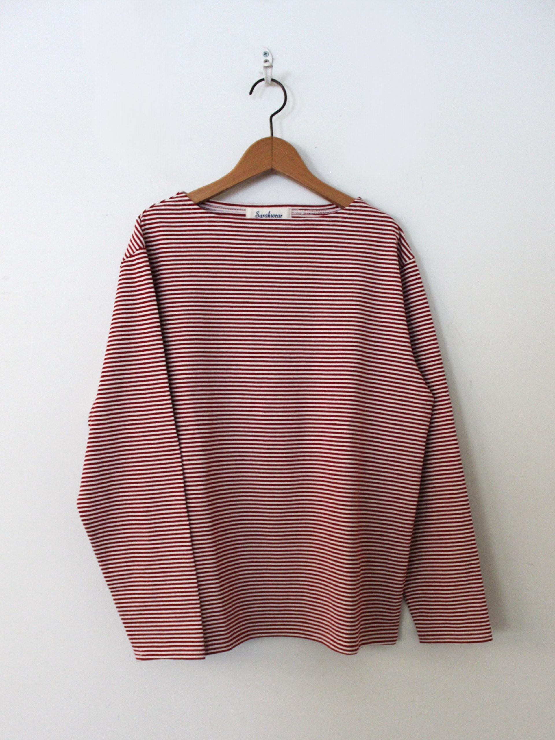 The ROSANNA Border Jersey Boat-Neck Tee by Sarahwear is a classic striped top updated with a new sizing range to allow for preferred fit selection. It is constructed from a tightly knit jersey featuring yarn spun using a specialized air-power twisting method. This technical process results in a fabric with a firm yet fluffy texture and a crisp yet soft feel, providing the garment with a distinct vintage character.
