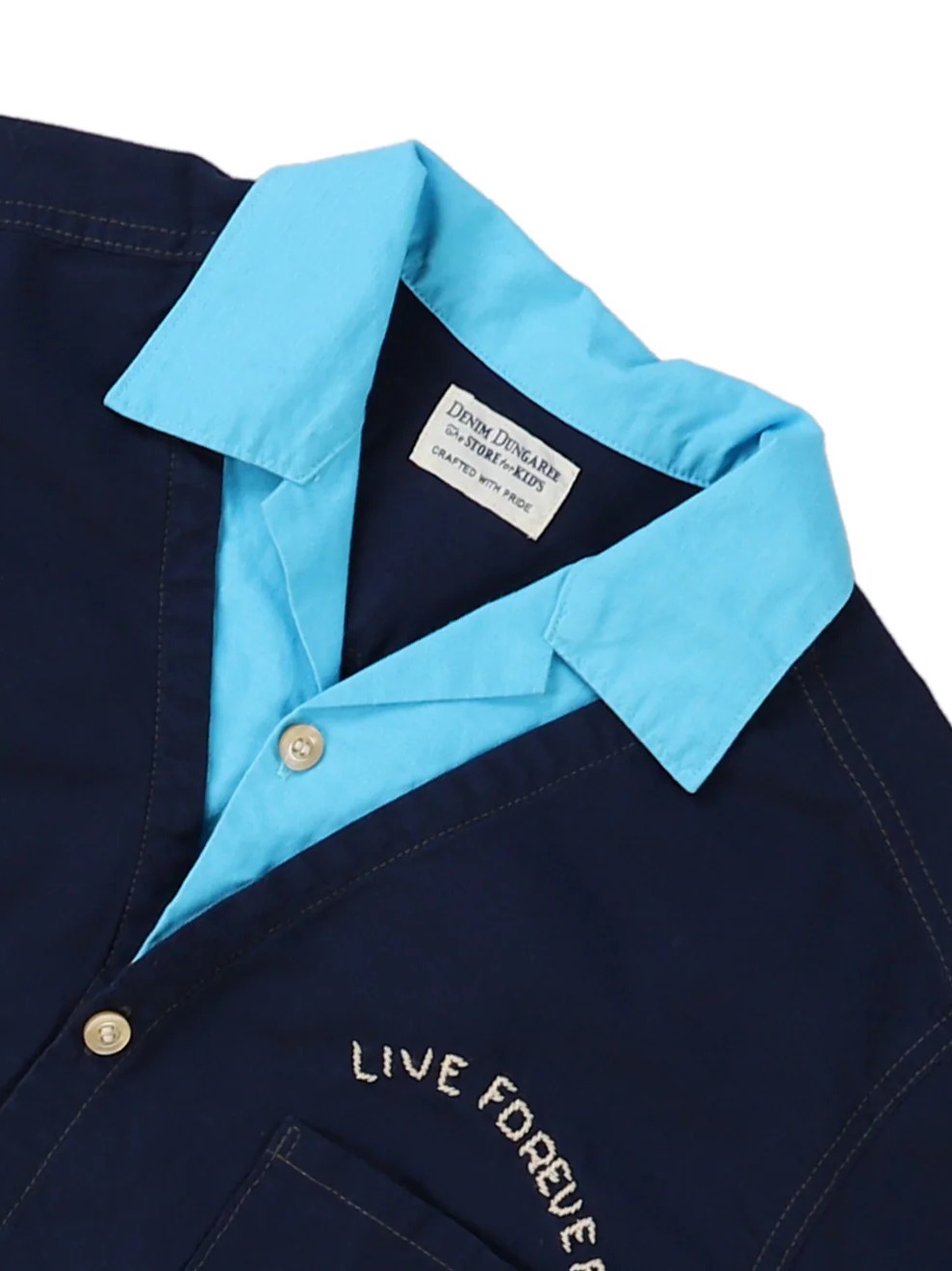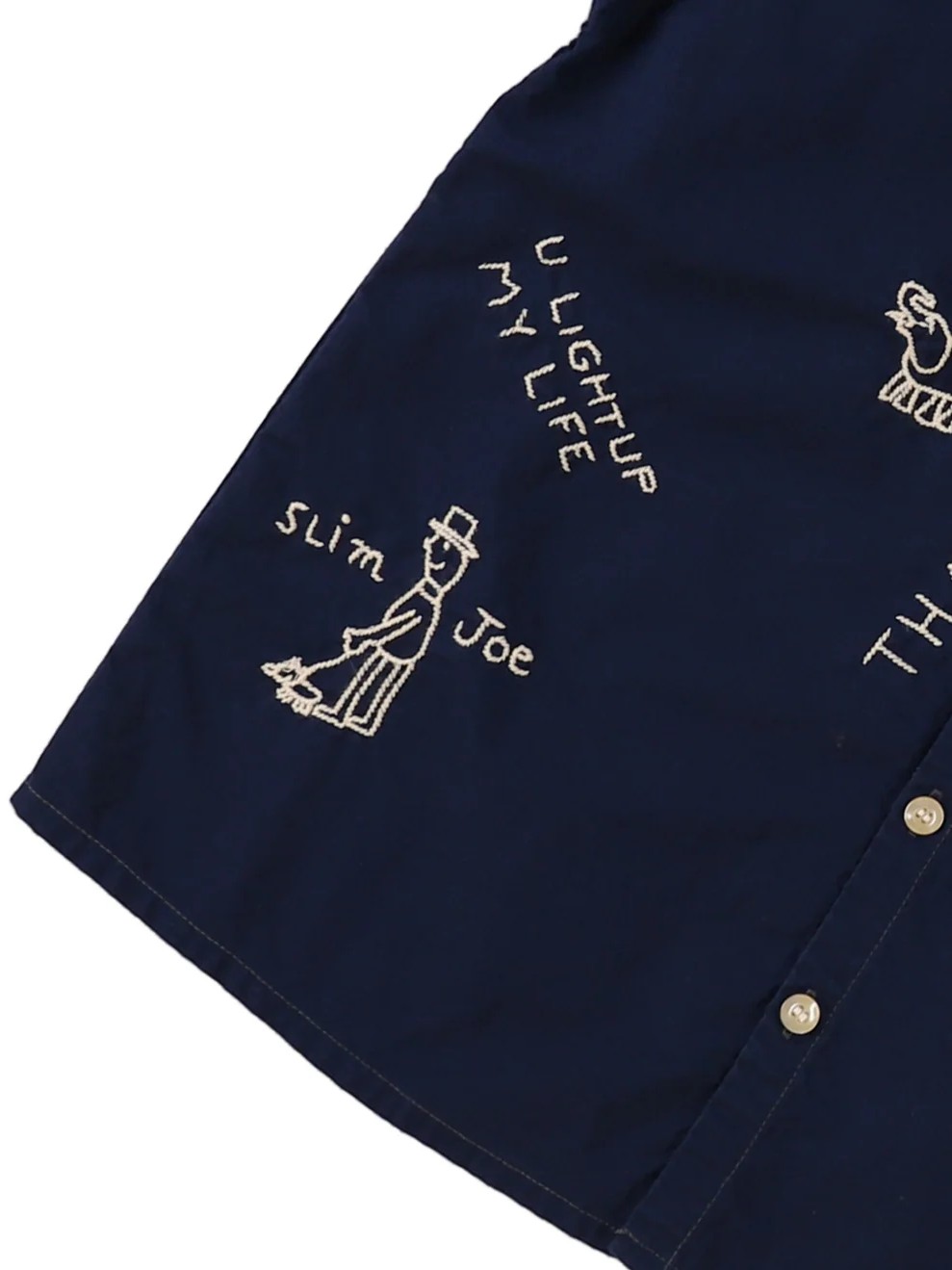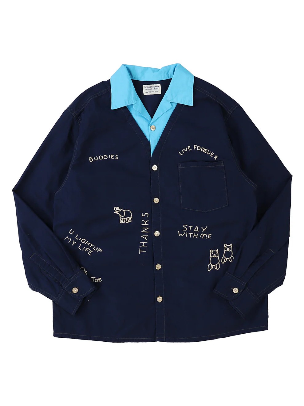 The Sheeting Scribble Shirt by Denim Dungaree is an interesting shirt featuring a unique 2-in-1 design where the inner shirt and vest are attached. This integrated construction creates a complete outfit in one piece, offering a perfectly layered aesthetic with the convenience of a single item. The front of the shirt is defined by incredibly striking embroidery that serves as a bold focal point, adding significant character to the silhouette.