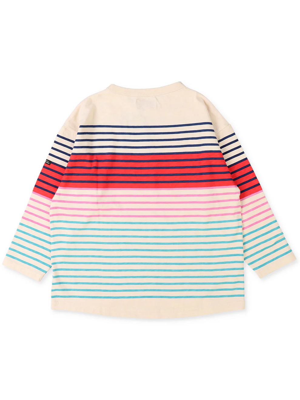 The SNOOPY Striped Print Tee by Denim Dungaree is a cute t-shirt featuring a multi-striped print. It has a Snoopy patch on the chest and a slightly high neckline.