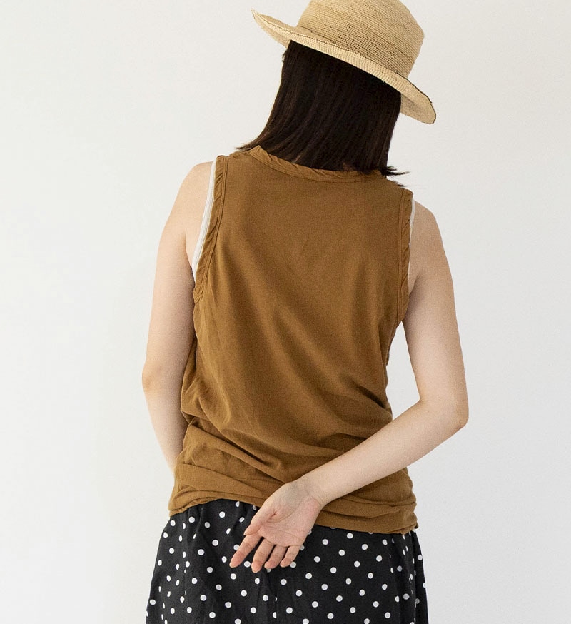 The Strong Twist Jersey Tank Top by Veritecoeur is made from 100% strong-twist jersey cotton, known for its durable, smooth fabric. It has a balanced length that is perfect for layering under other items and can be worn year-round.