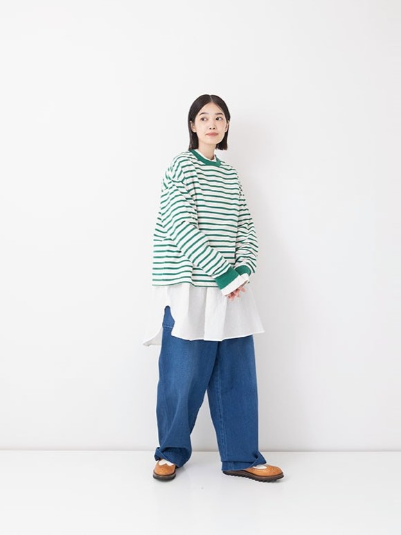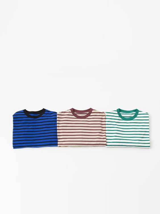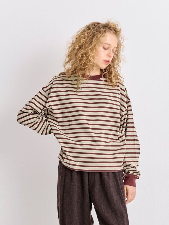 The Taco Cotton Striped L/S T-shirt by Veritecoeur is a longsleeve shirt with a striped pattern with and color scheme that suits autumn and winter. Its good thickness and firmness help it resist losing its shape and keep a clean silhouette. This piece is intentional about its weight, making it great to wear on its own, and its sizing, which makes it useful as an inner layer.