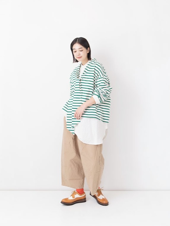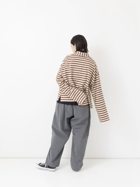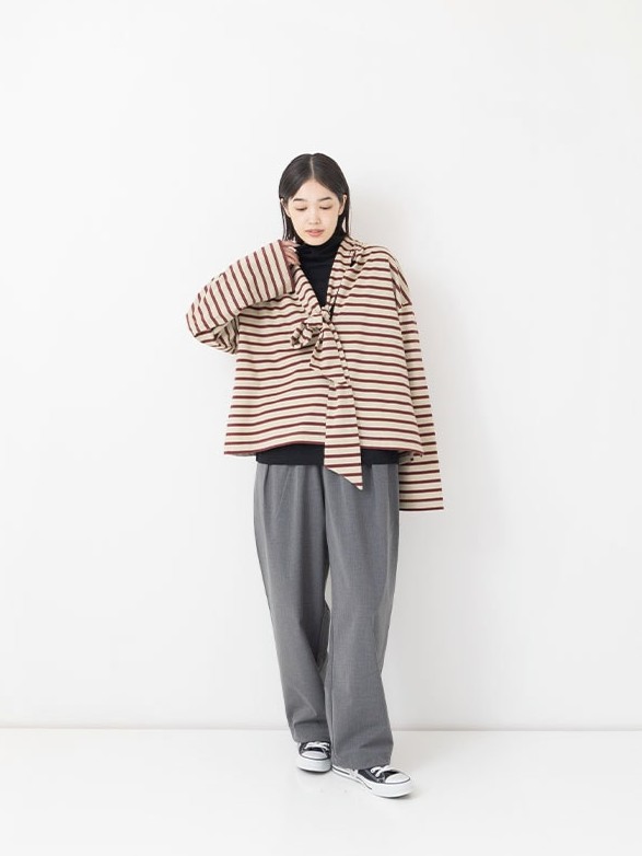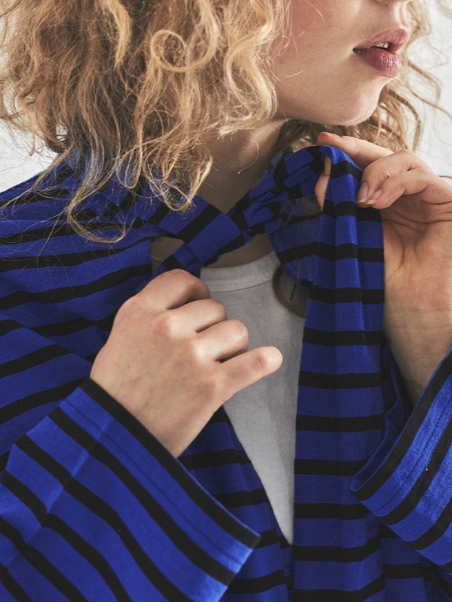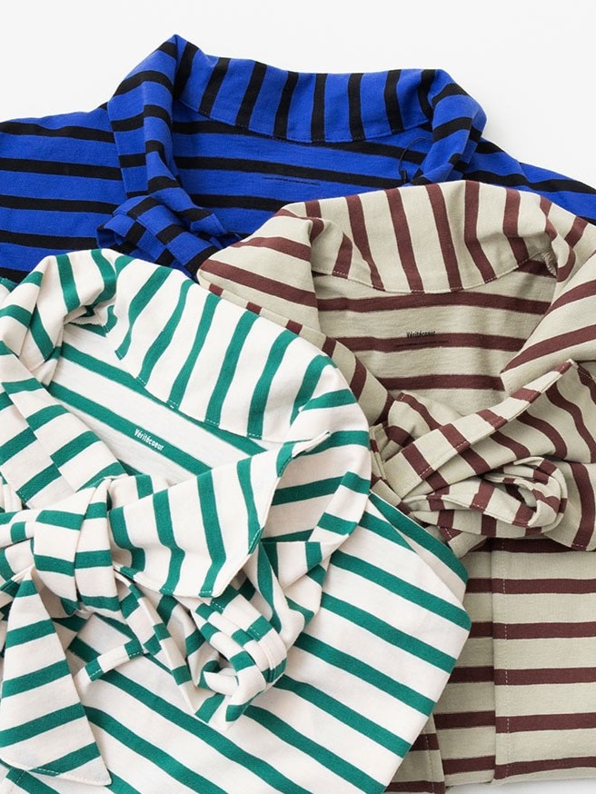 The Taco Cotton Striped Tie Tee by Veritecoeur features a thick tie that serves as a key styling detail; you can enjoy wearing it tied in a bow with a knit or loosely untied under a jacket. It is made from Mexican Taco Cotton and features a yarn-dyed stripe pattern that is tightly and carefully knit. The yarn has a soft fullness and a gentle texture. The fabric has good thickness and firmness, which helps it keep its clean silhouette and resist losing its shape.