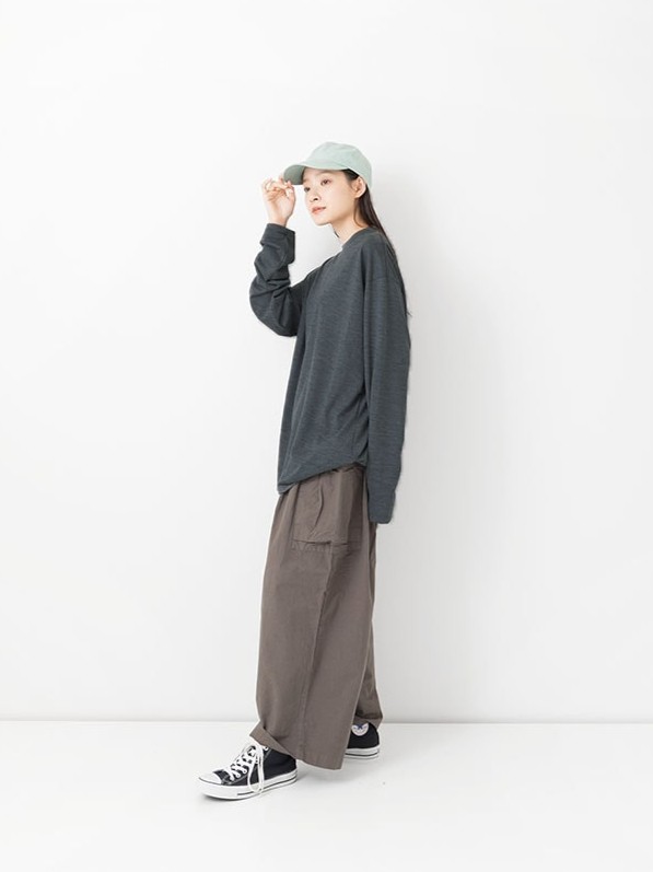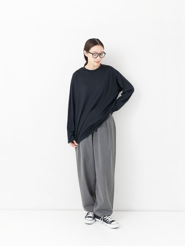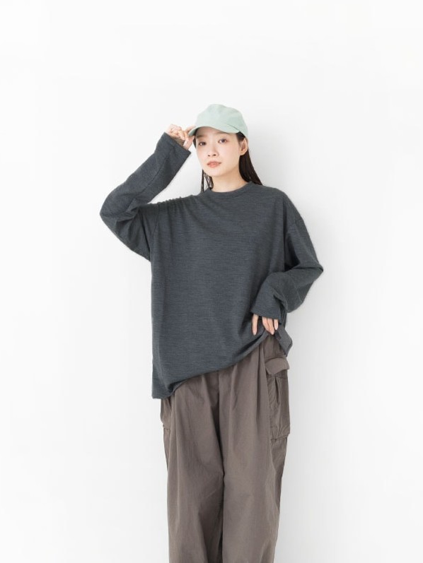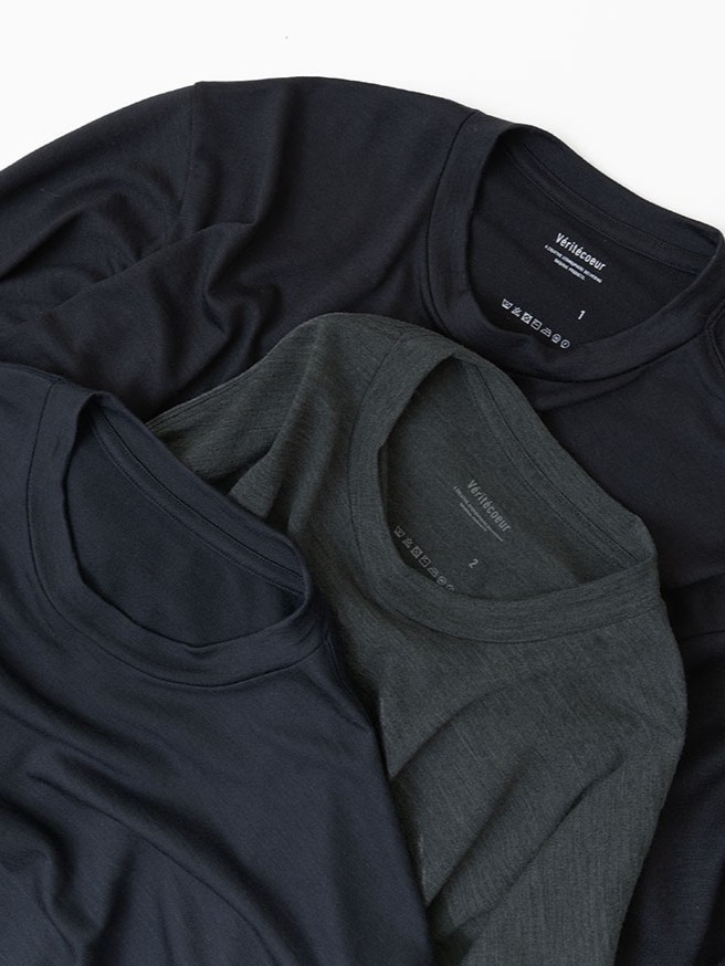 The Unisex Preshrunk Wool L/S Tee by Veritecoeur has a box silhouette. The sleeves have extra room, creating a draped silhouette.