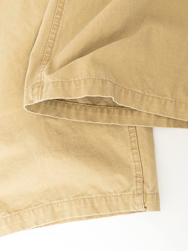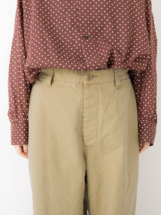 The Easy Work Pants by Veritecoeur are constructed from a thick, tough cotton poplin fabric featuring a higher thread count than usual for a firm and resilient feel. Utilizing uneven sulfur-dyed yarns in both the warp and weft, the material is designed to fade with repeated wear, developing a unique patina over time.