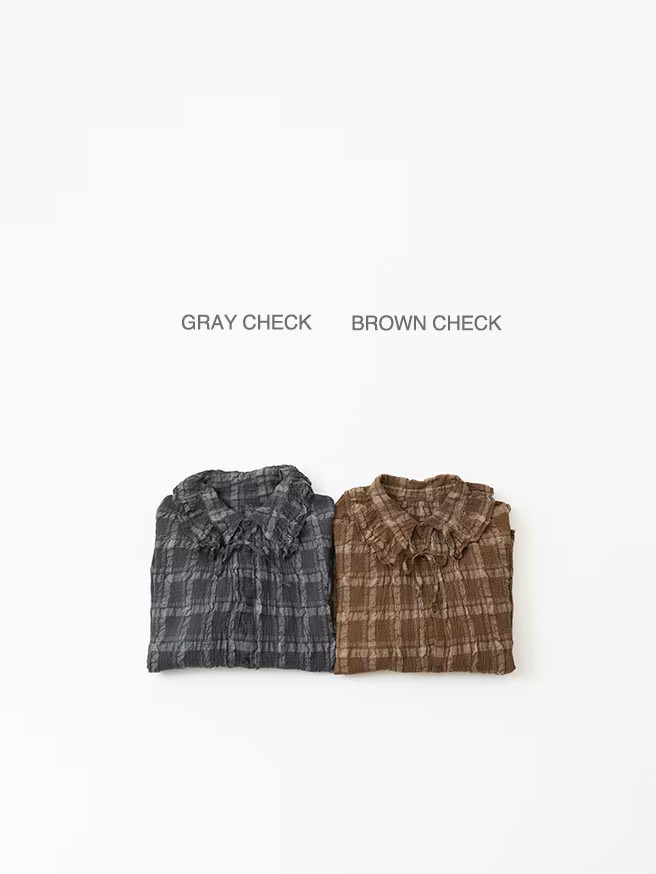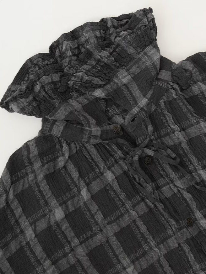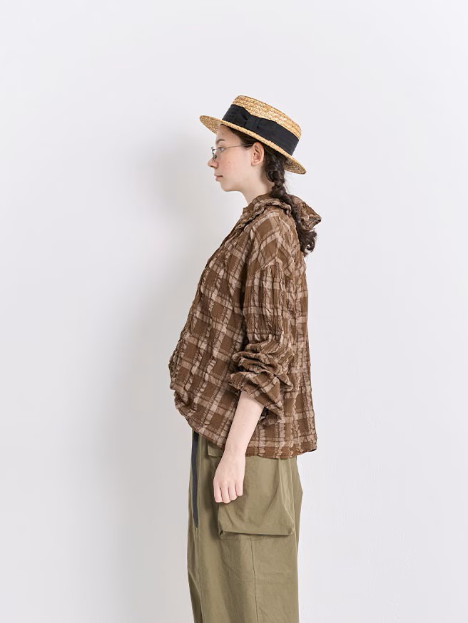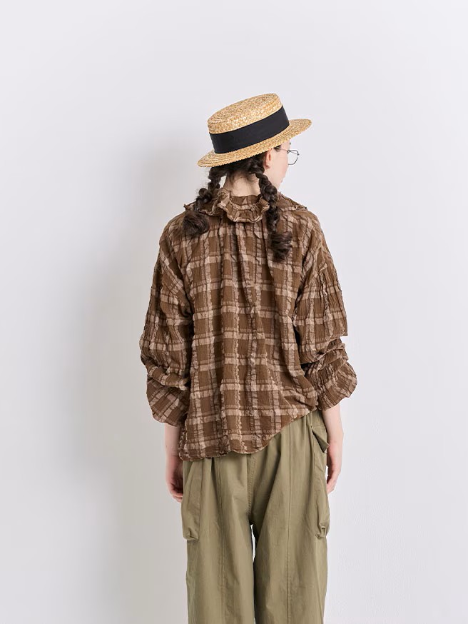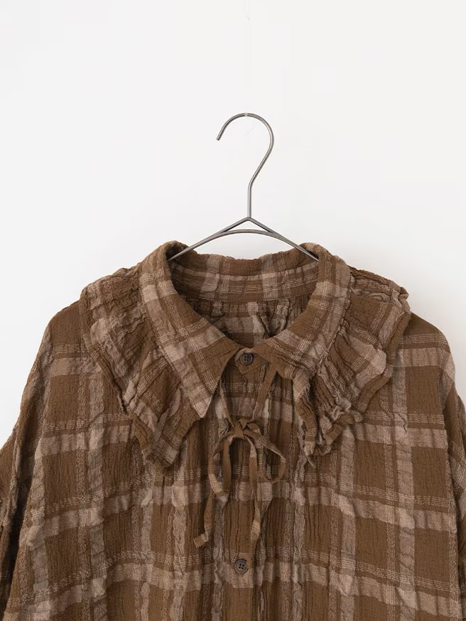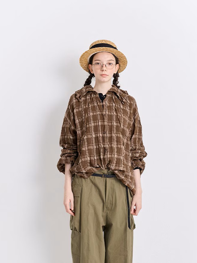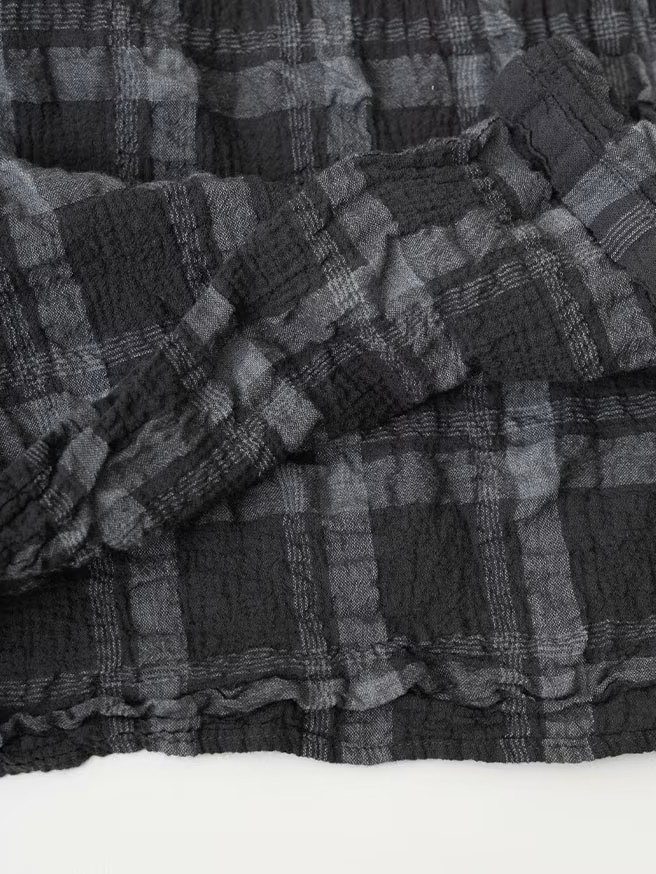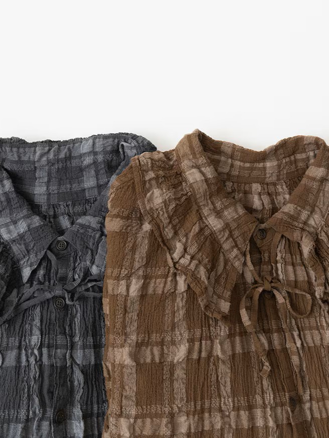 The Favorite Check Blouse by Veritecoeur is engineered from a lightweight plain weave fabric characterized by a distinctive, permanent crinkled texture. This three-dimensional effect is achieved through a specialized blend of cotton, polyester, and linen, which is garment-dyed to capitalize on the varying shrinkage rates of the fibers.