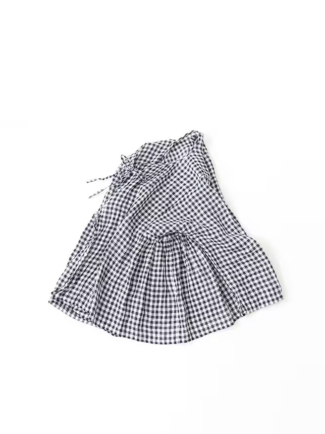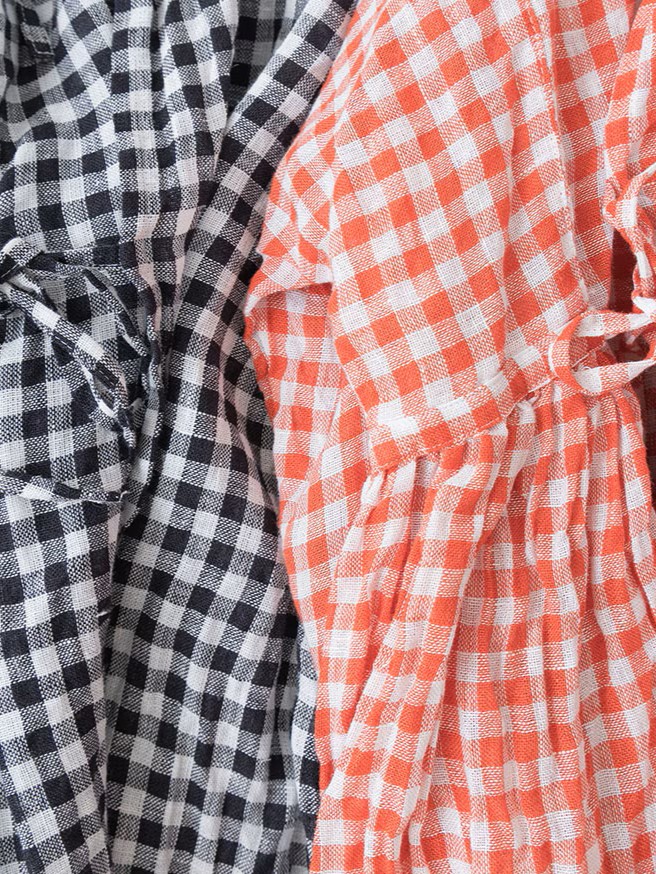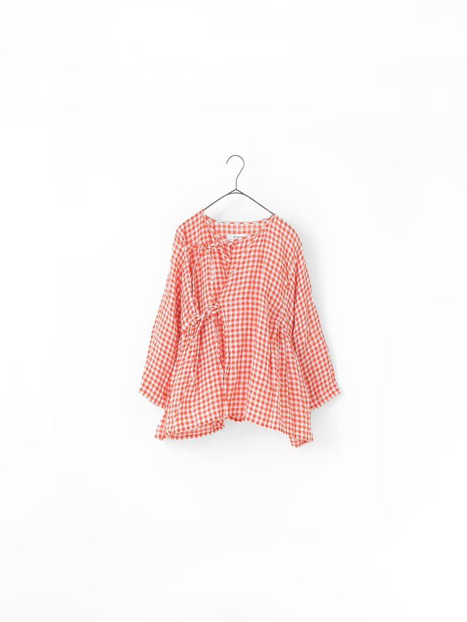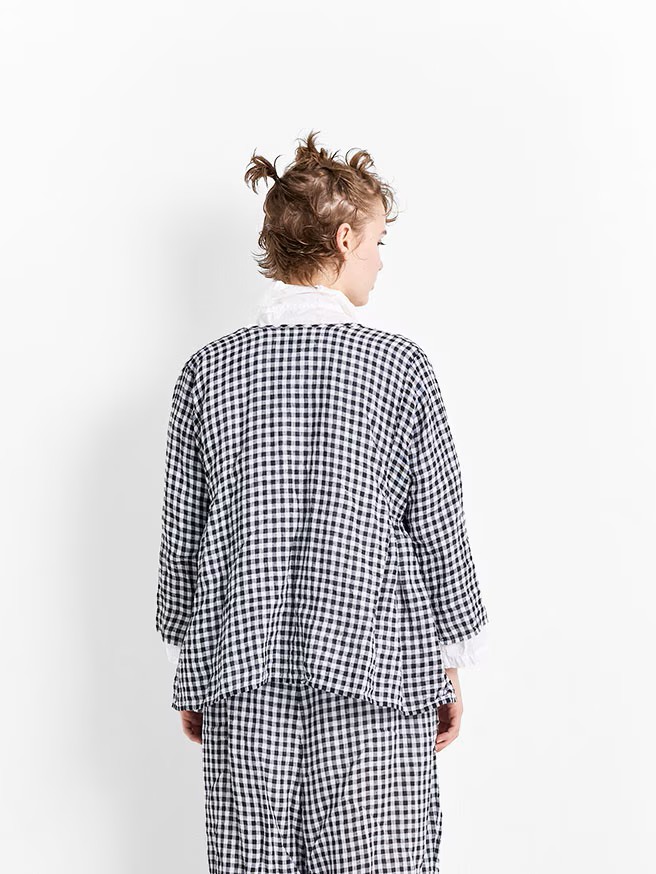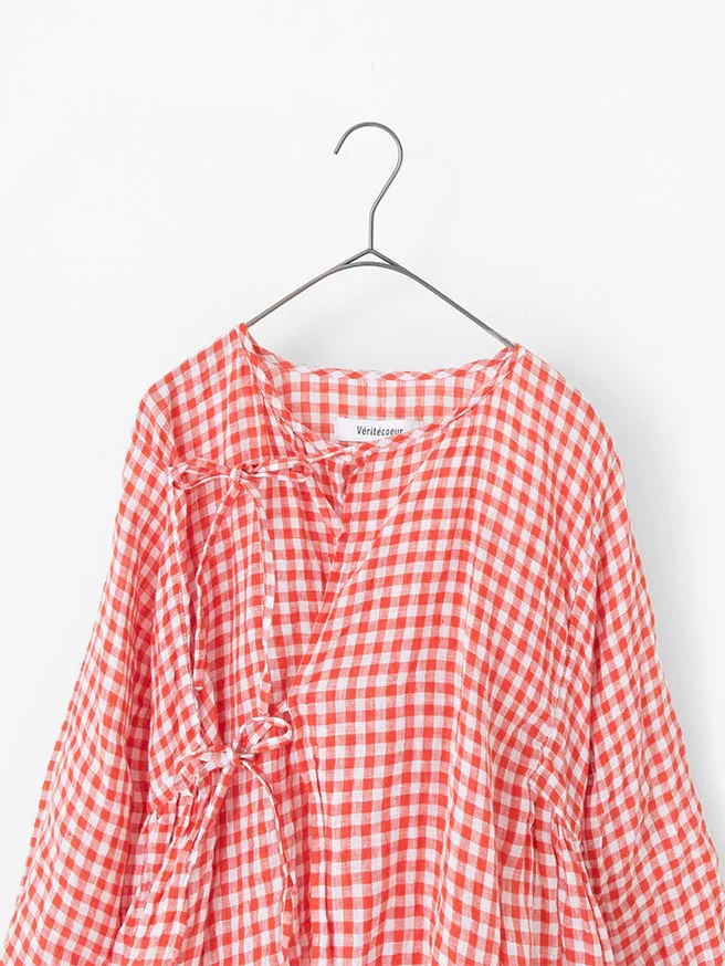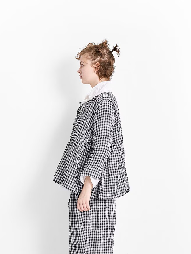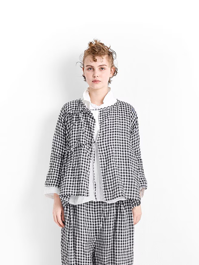 The Gingham Check Wrap Blouse by Veritecoeur is crafted from an original linen material featuring a striking gingham check pattern. Designed for the warmer seasons, the fabric utilizes a loose weave of thick linen yarn that has been washed to achieve a soft, lightweight voile texture with superior breathability. This collarless blouse is detailed with side gathers that produce a flowing silhouette, offering a sophisticated drape that moves with the wearer.