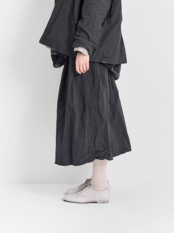 The Pleated Skirt by Veritecoeur is crafted from a crisp cotton-silk broadcloth woven at a high density. The fabric features smooth combed cotton yarn in the warp and a cotton-silk blend in the weft, resulting in a texture that is both crisp and supple.