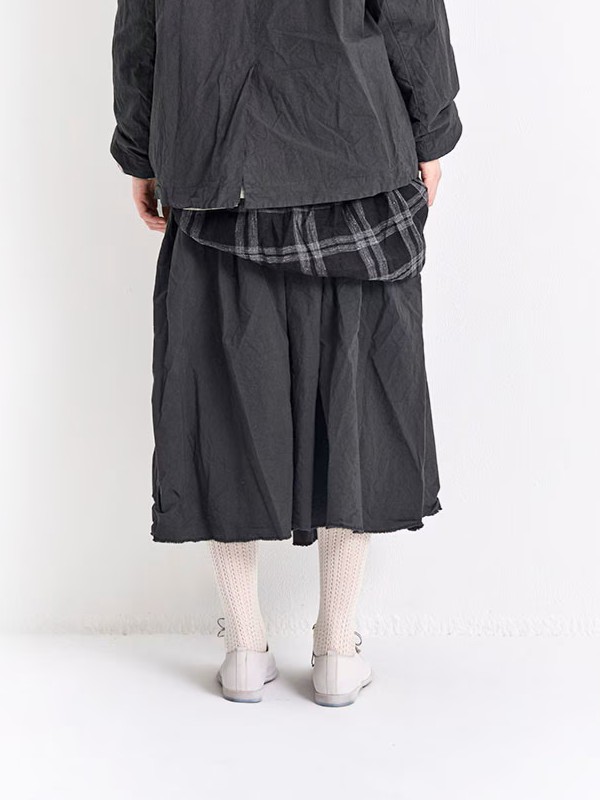 This skirt has been garment dyed to achieve a washed appearance and utilizes selvedge fabric at the hem for a thin and light finish. The waist construction includes elastic only at the back and an integrated string for size adjustment.