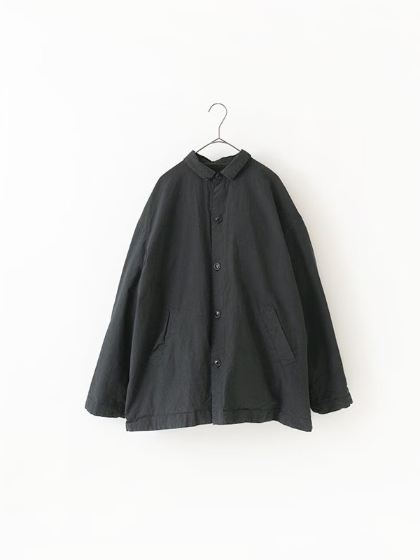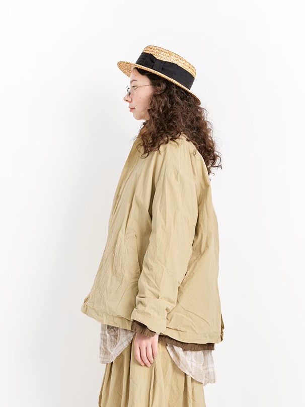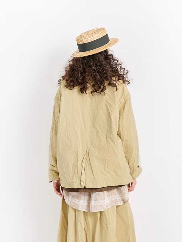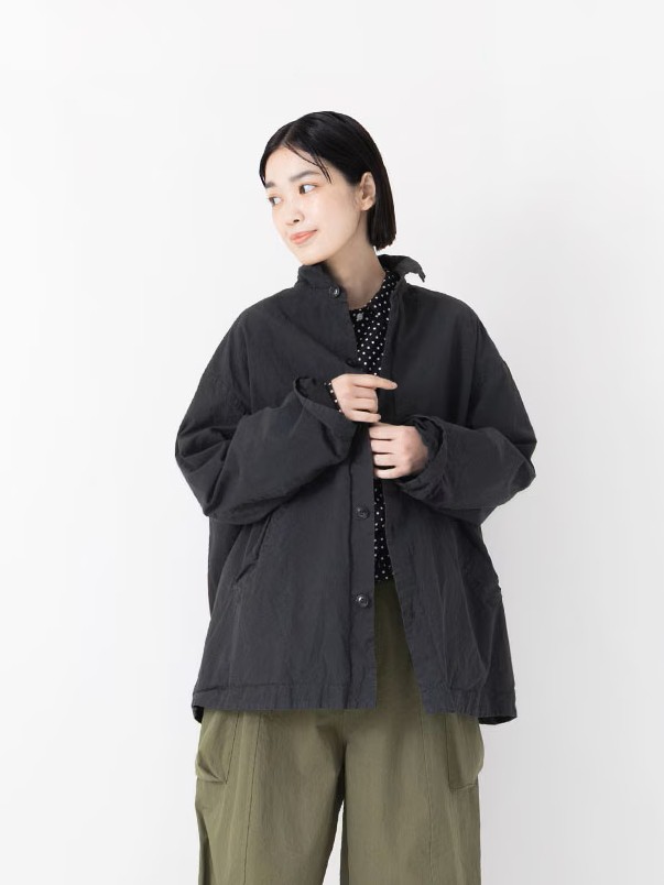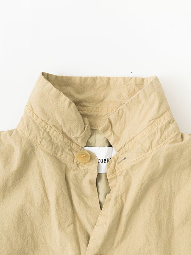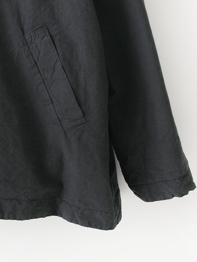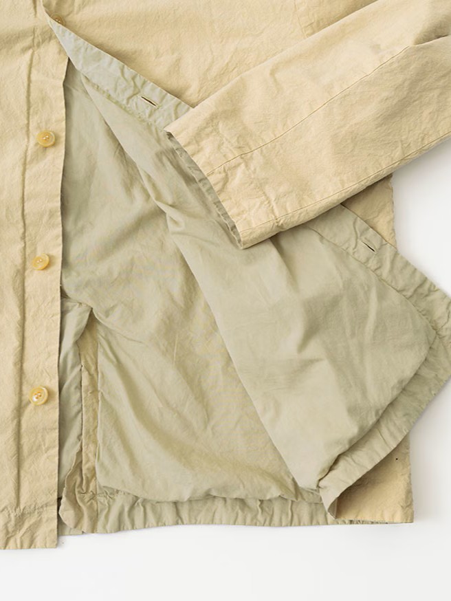 The garment is constructed with two layers, including a cotton broadcloth lining, and has been garment dyed to produce a washed look. To ensure a lightweight feel, the design of the front, hem, and cuffs is kept as simple as possible.