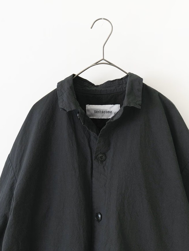The Shirt Jacket by Veritecoeur is crafted from a crisp cotton-silk broadcloth, featuring a warp of smooth combed cotton yarn and a weft of a cotton-silk blend. This high-density weave utilizes high-quality yarns to achieve a texture that is both crisp and supple with a smooth feel.