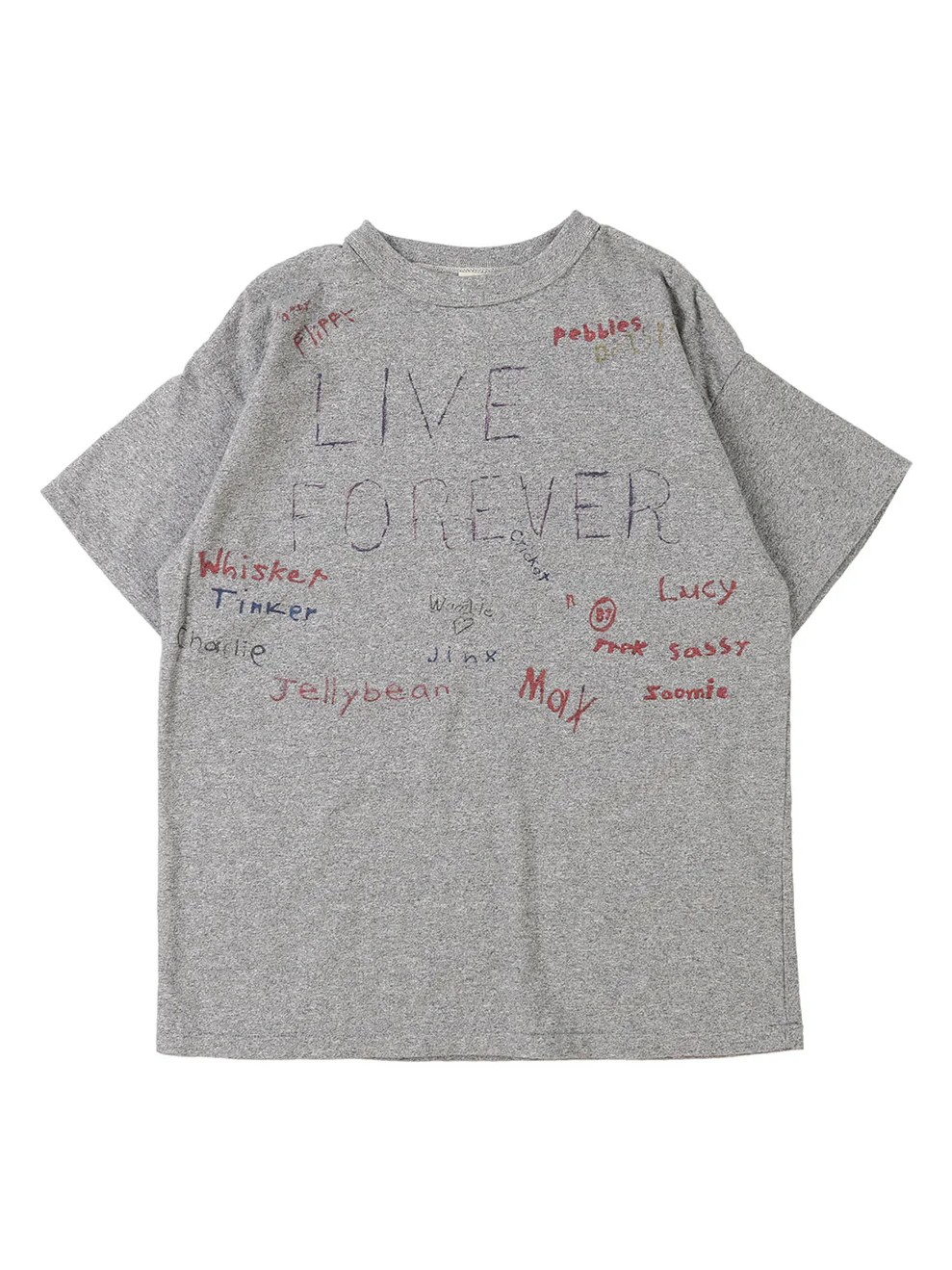 The Vintage Cotton Jersey LIVE Tee by Denim Dungaree features doodles all over the T-shirt that express heartfelt feelings for dogs. This expressive design creates a playful and high-impact look that remains cute even when styled as a base layer. When worn under a shirt, the doodles are designed to peek out, adding a unique and charming visual detail to your outfit. This T-shirt serves as a versatile statement piece that balances a fun, artistic aesthetic with effortless layering potential.