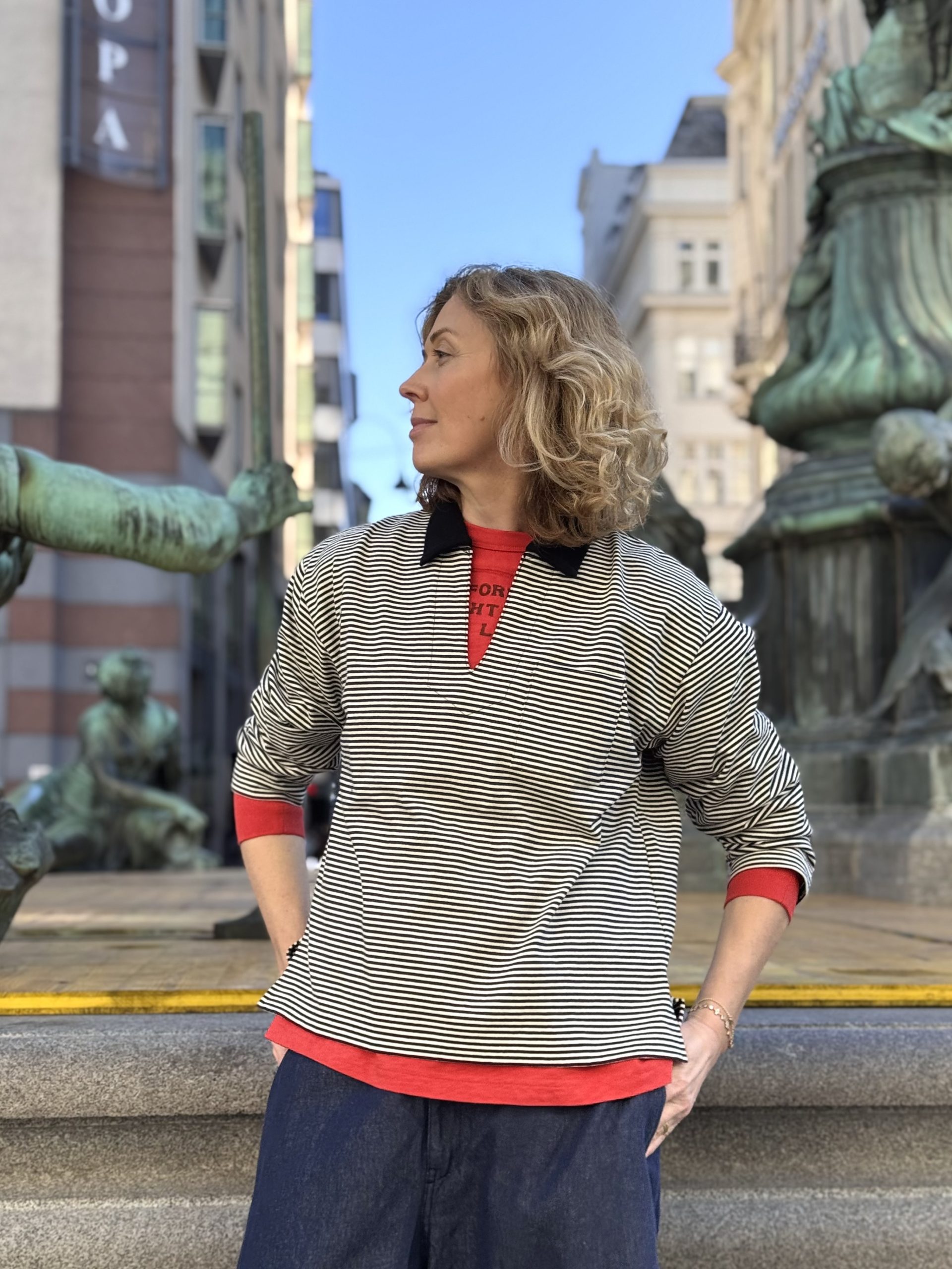 The Vintage Stripe Jersey Shirt by Sarahwear is a fresh, fine-striped skimmer shirt with a relaxed fit and a chest pocket. Made from a special yarn spun using air-twisting techniques, the jersey fabric is firm to the touch but has a slight puff and a balance of crispness and softness.