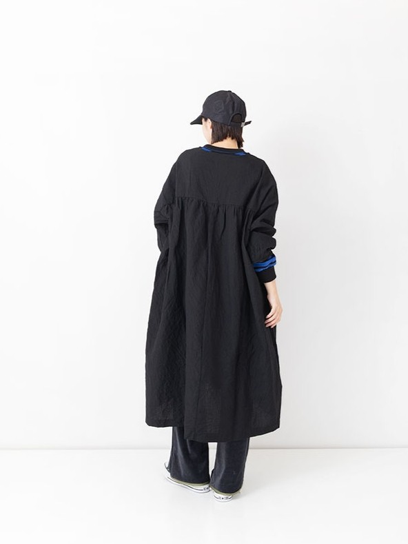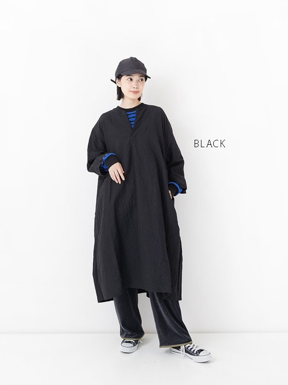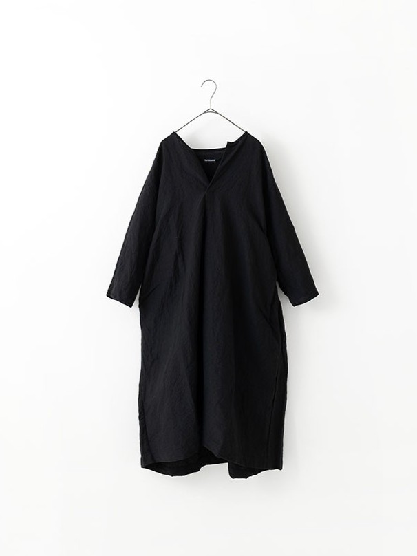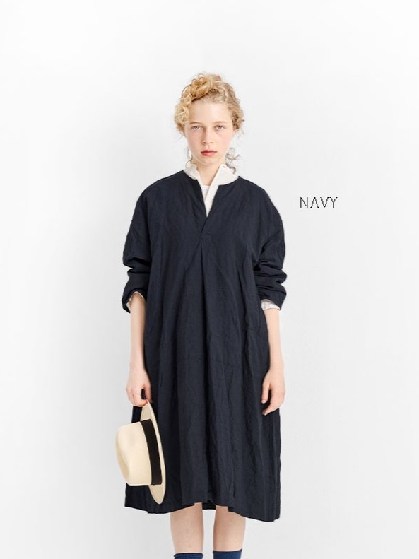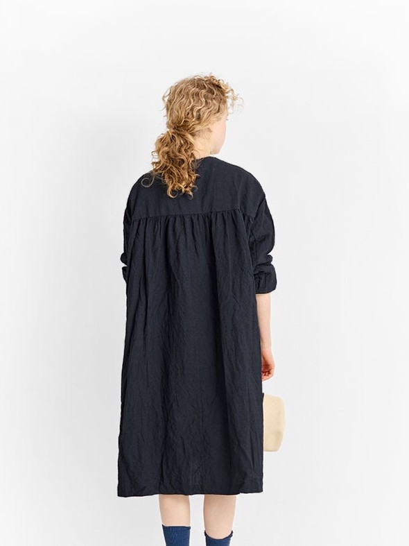 The Wool Linen Skipper Dress by Veritecoeur is a relaxed-fitting dress with a skipper-style front opening. It offers two different looks: a clean shirt sleeve front and a back with a gathered yoke sleeve. The material is a wool-linen plain weave with a dry texture.